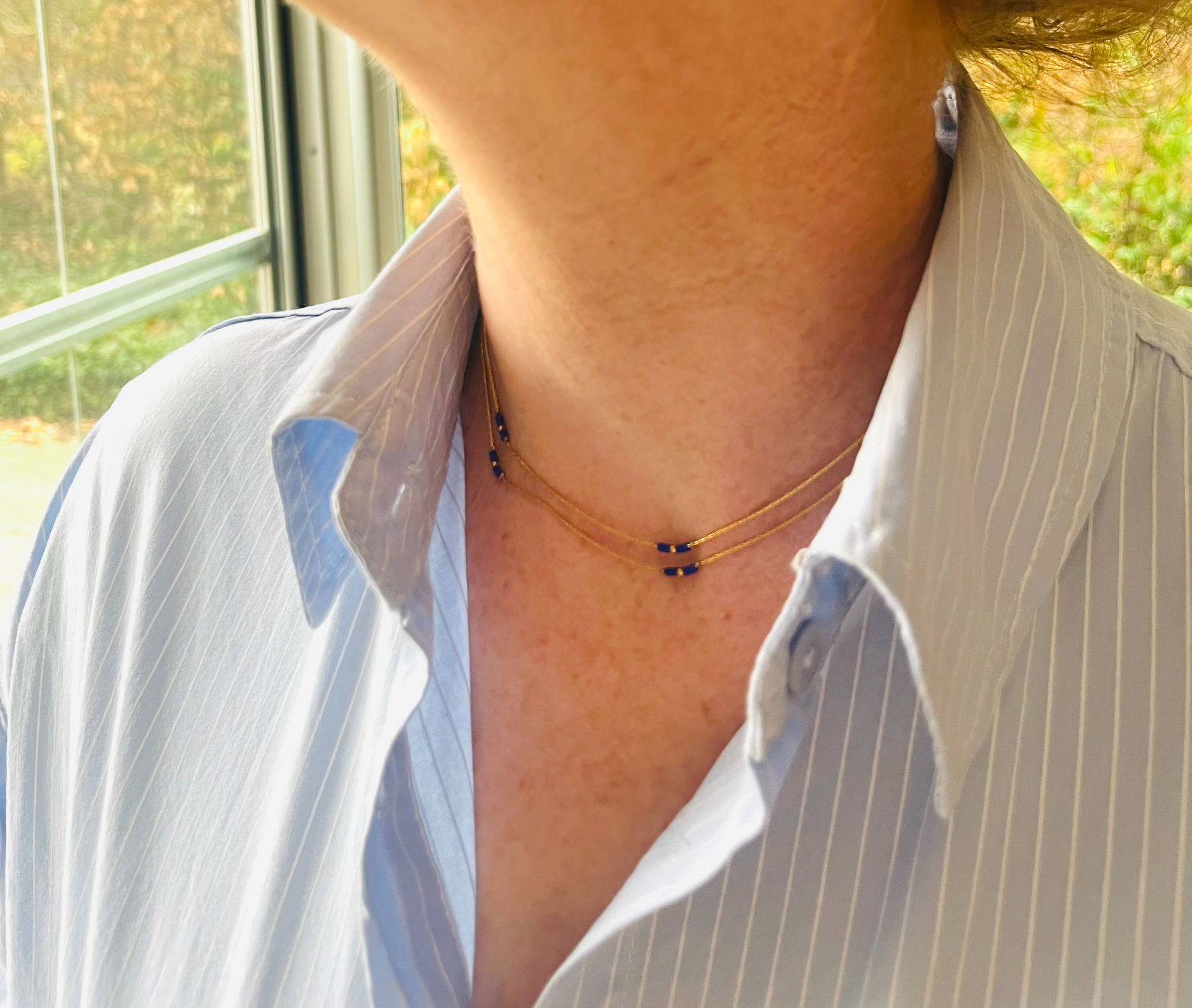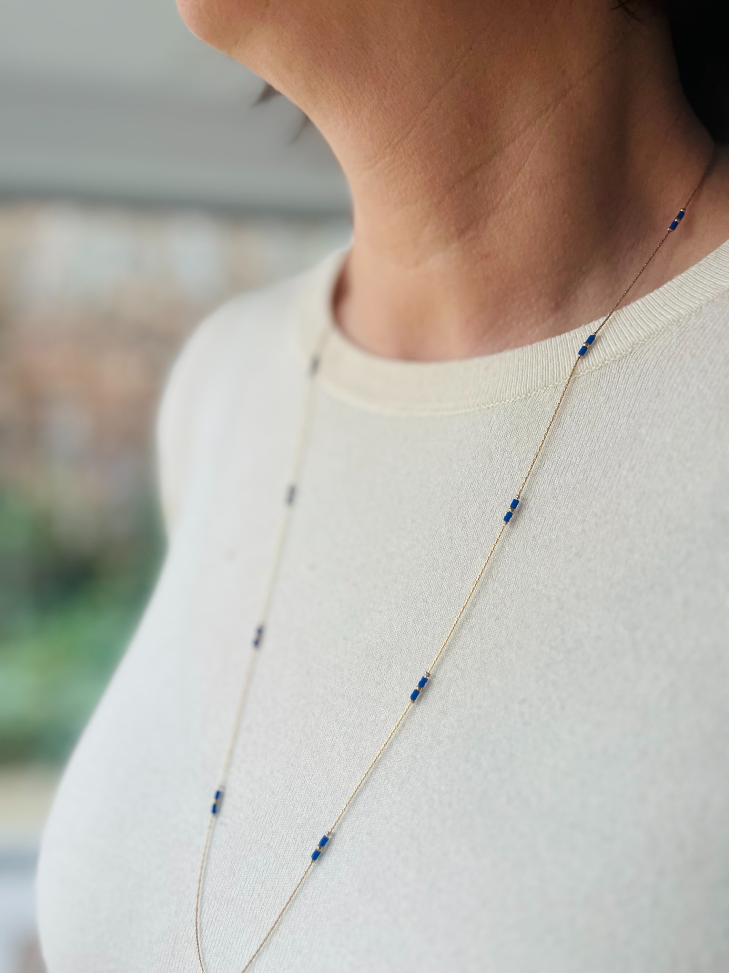 Lange fijne ketting afgewisseld met felblauwe pareltjes om zowel kort rond de hals als lang te dragen.